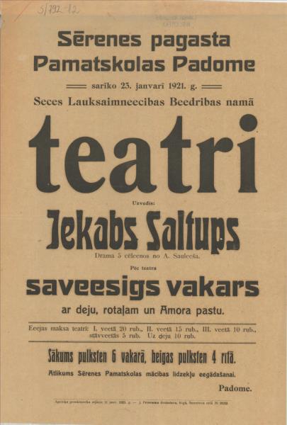 Sērenes pagasta Pamatskolas Padome sarīko 23. janvārī 1921. g. Seces Lauksaimniecības Biedrības namā teātri uzvedīs "Jēkabs Saltups''
