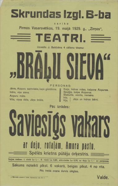 Skrundas Izgl. B-ba sarīko Pirmos Vasarsvētkos, 19. maijā 1929. g., "Zirņos" teatri. Uzvedīs J. Baldzēna Brāļu sieva