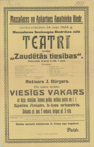 Mazsalaces un Apkārtnes Amatnieku Biedr. sarīko svētdien, 14. sept. 1924. g. Mazsalacas Saviesīgās Biedrības zālē teatri Izrādīs: Zaudētās tiesības Aspazijas drāma