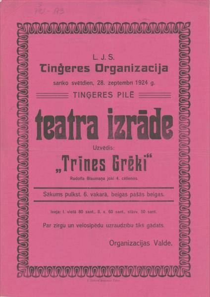 L.J. S. Tinģeres Organizācija sarīko svētdien, 28. septembrī 1924 g. Tinģeres pilē teatra izrāde Uzvedīs Trīnes grēki