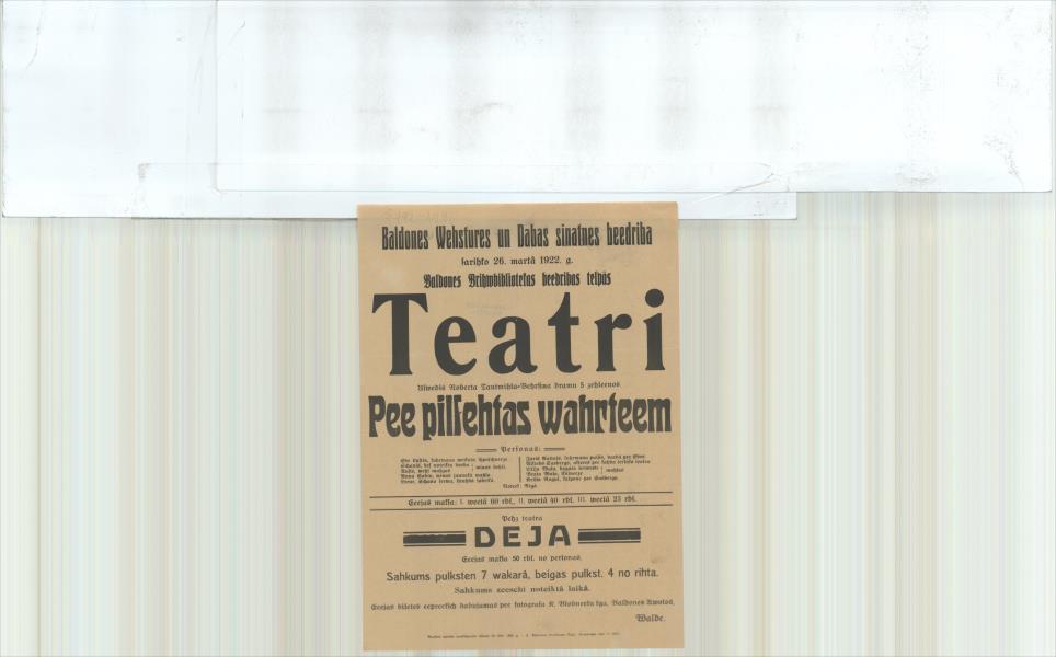 Baldones Wēstures un Dabas zinatnes biedrība sarīko 26. martā 1922. g. teātri Uzvedīs RobertaTautmīļa-Bērziņa Pie pilsētas vārtiem