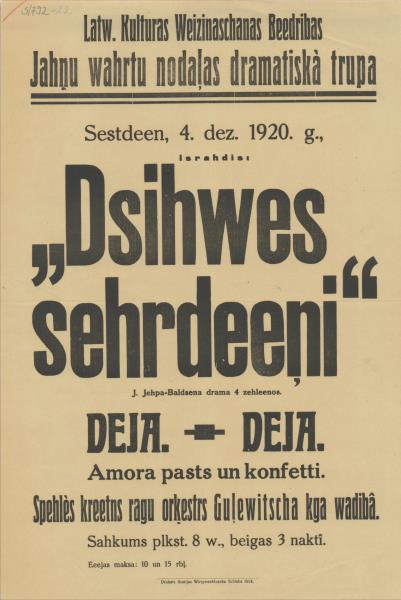 Latv. Kulturas Veicināšanas biedrības Jāņu vārtu nodaļas dramatiskā trupa sestdien, 4. dez. 1920. g., izrādīs Dzīves sērdieņi