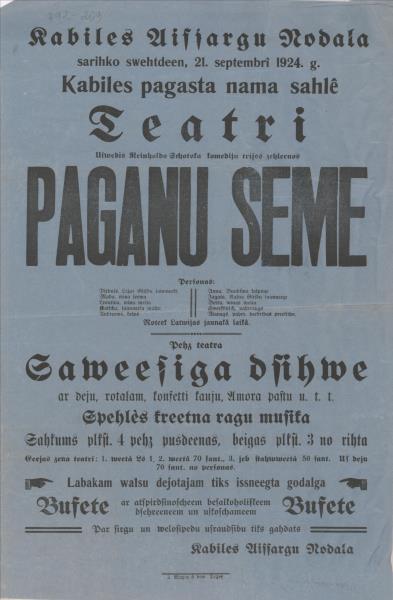 Kabiles Aizsargu Nodaļa sarīko svētdien, 21. septembrī 1924. g. Kabiles pagasta nama zālē teatri Uzvedīs Reinholda Šotoka Pagānu zeme