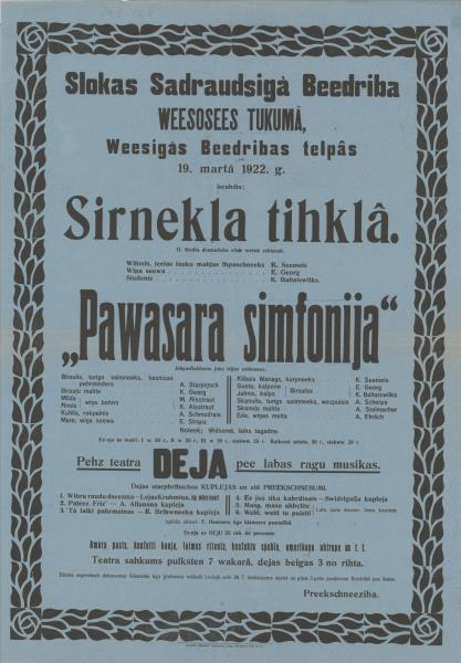Slokas Sadraudzīgā Biedrība viesosies Tukumā, Wiesīgās Biedrības telpās 19. martā 1922. g. Izrādīs: Zirnekļa tīklā Pavasara simfonija