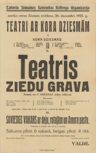Latviešu Jaunatnes Savienības Kolberģa Organizācija sarīko otros Ziemas svētkos, 26. decembrī 1922. g. I. Kora dziesmas II. Teatris Ziedu grava Drama no P. Gruznas