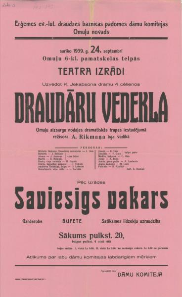 Ērģemes ev-lut draudzes baznīcas padomes dāmu komitejas Omuļu novads sarīko 1939. g. 24. septembrī teatra izradi Draudāru vedekla