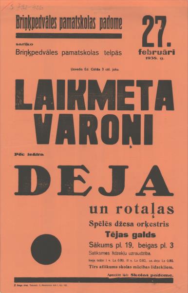 Briņķpedvales pamatskolas padome sarīko 27. februārī 1938. g. Uzvedīs Laikmeta varoņi