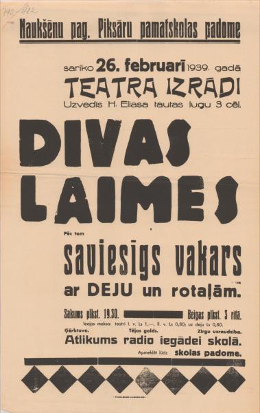 Naukšēnu pag. Piksāru pamatskolas padome sarīko 26. februārī 1939. gadā teātra izrādi Uzvedīs Divas laimes