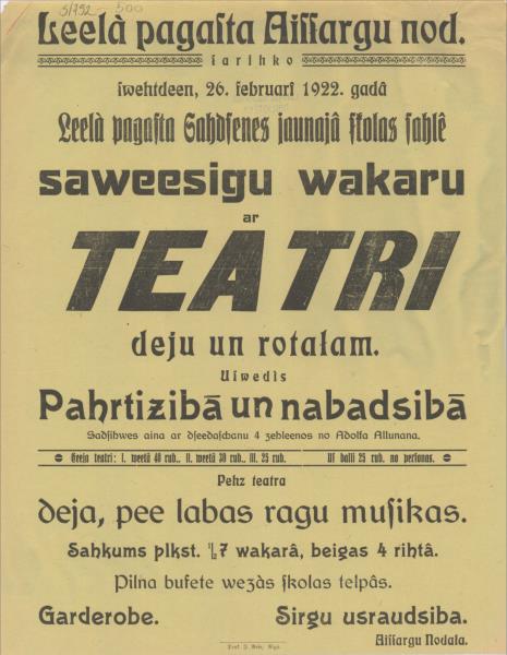 Lielā pagasta Aizsargu nod. sarīko 26. februārī 1922. gadā saviesīgu vakaru ar teātri Uzvedīs Pārticībā un nabadzībā