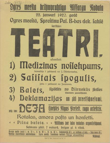 Ogres miesta brīvprātīgo Aizsargu Nodaļa 22. janvārī 1922. gadā sarīko teātri, uzvedot 1) Medicīnas noslēpums,2)Sasistais spogulis
