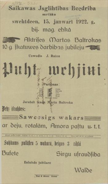 Saikavas Izglītības Biedrība sarīko 15. janvārī 1922. g. aktrises Martas Baltrokas 10 g. skatuves darbības jubileju Uzvedīs J. Raiņa Pūt vējiņi