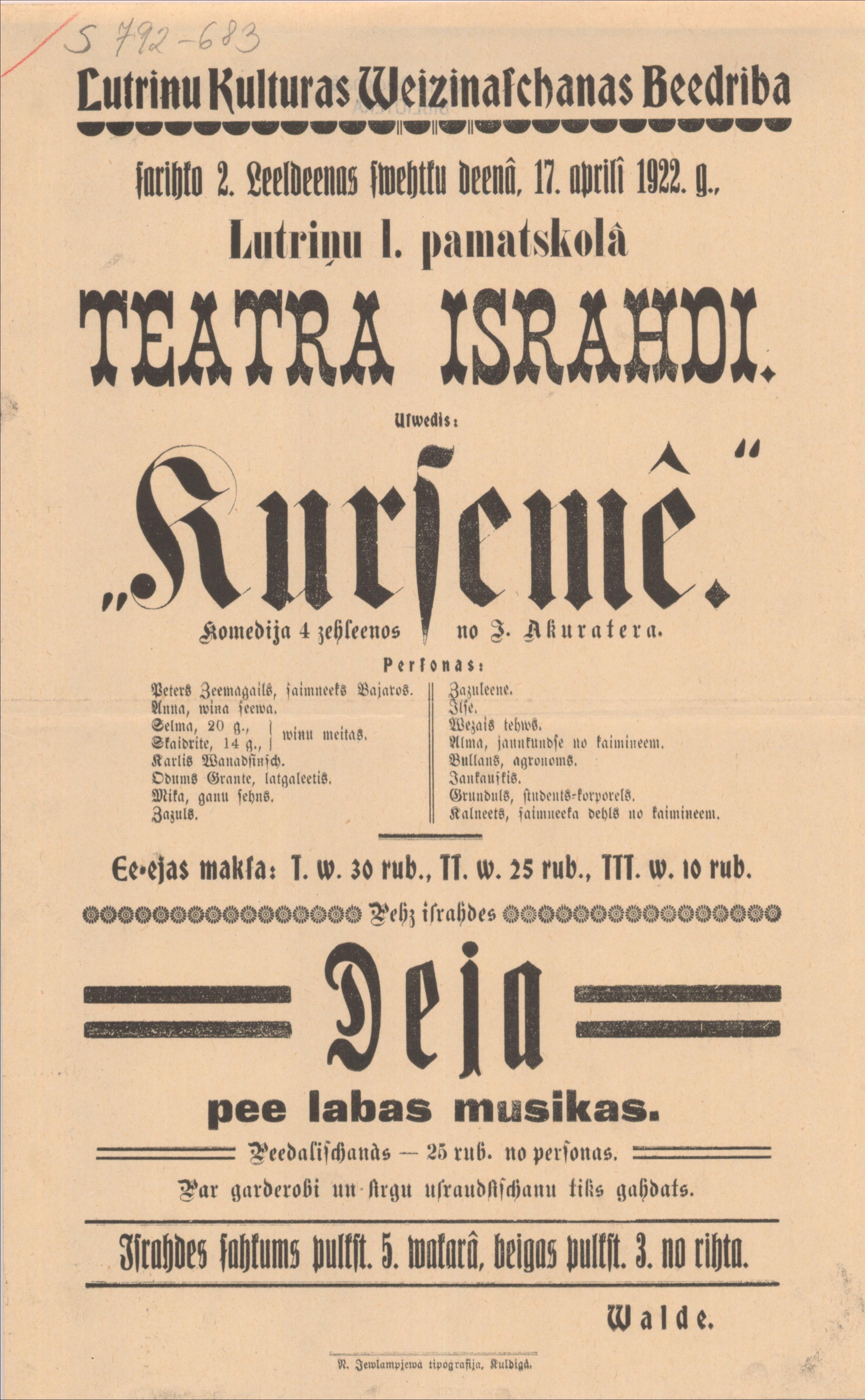 Lutriņu Kulturas Veicināšanas Biedrība sarīko 17. aprīlī 1922. g. teātra izrādi. Uzvedīs: Kurzemē
