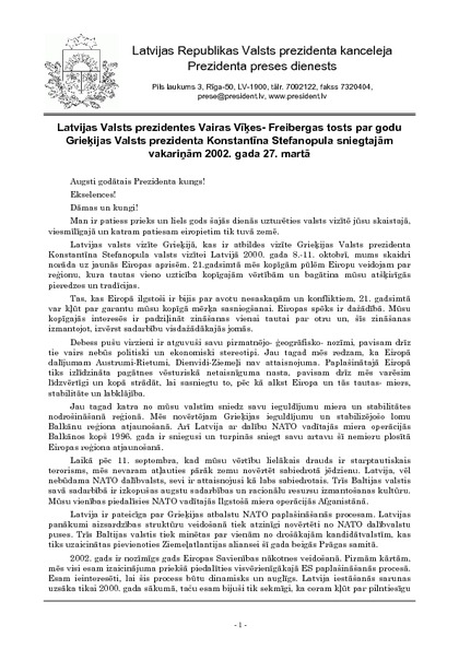 Latvijas Valsts prezidentes Vairas Vīķes- Freibergas tosts par godu Grieķijas Valsts prezidenta Konstantīna Stefanopula sniegtajām vakariņām 2002. gada 27. martā