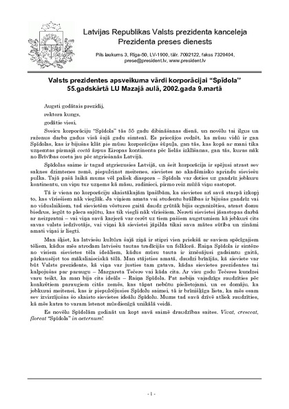 Valsts prezidentes apsveikuma vārdi korporācijai “Spīdola” 55.gadskārtā LU Mazajā aulā, 2002.gada 9.martā