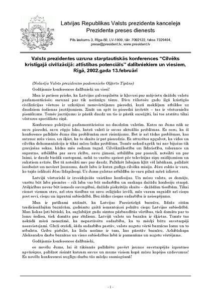 Valsts prezidentes uzruna starptautiskās konferences “Cilvēks kristīgajā civilizācijā: attīstības potenciāls” dalībniekiem un viesiem, Rīgā, 2002.gada 13.februārī