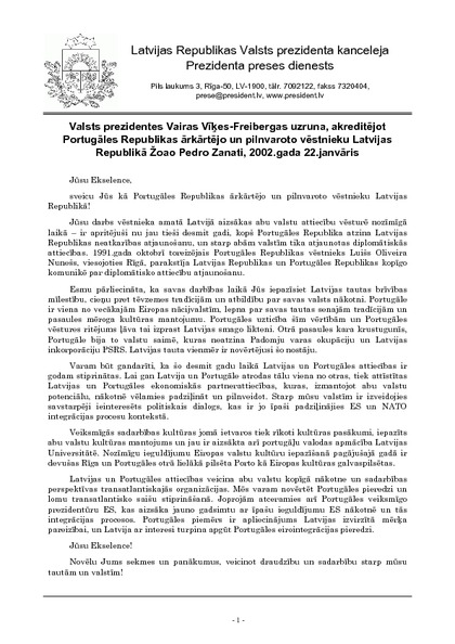 Valsts prezidentes Vairas Vīķes-Freibergas uzruna, akreditējot Portugāles Republikas ārkārtējo un pilnvaroto vēstnieku Latvijas Republikā Žoao Pedro Zanati, 2002.gada 22.janvāris