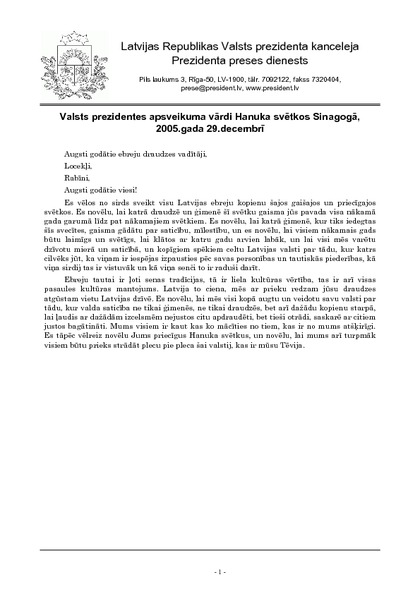 Valsts prezidentes apsveikuma vārdi Hanuka svētkos Sinagogā, 2005.gada 29.decembrī