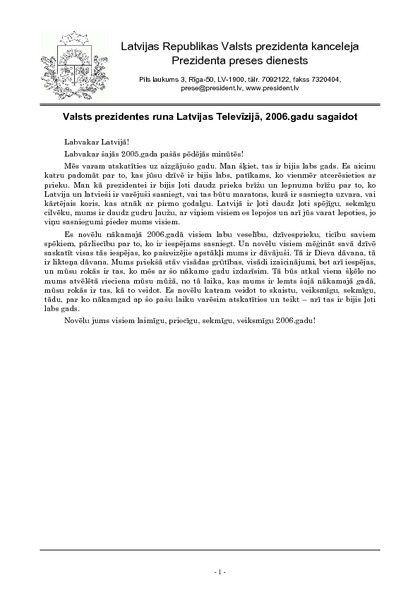 Valsts prezidentes runa Latvijas Televīzijā, 2006.gadu sagaidot