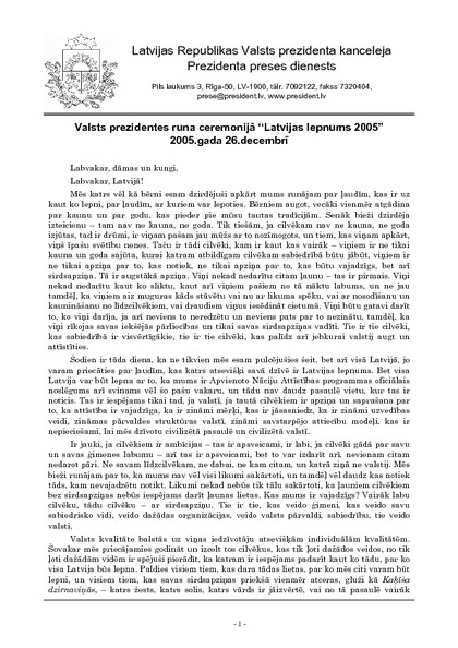 Valsts prezidentes runa ceremonijā “Latvijas lepnums 2005” 2005.gada 26.decembrī