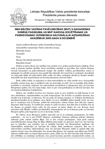 NBS MĀCĪBU VADĪBAS PAVĒLNIECĪBAS (MVP) 5.GADADIENAS SVINĪGĀ PASĀKUMA UN MVP KAROGA IESVĒTĪŠANAS UN PASNIEGŠANAS CEREMONIJA NACIONĀLAJĀ AIZSARDZĪBAS AKADĒMIJĀ 2005.GADA 9.DECEMBRĪ