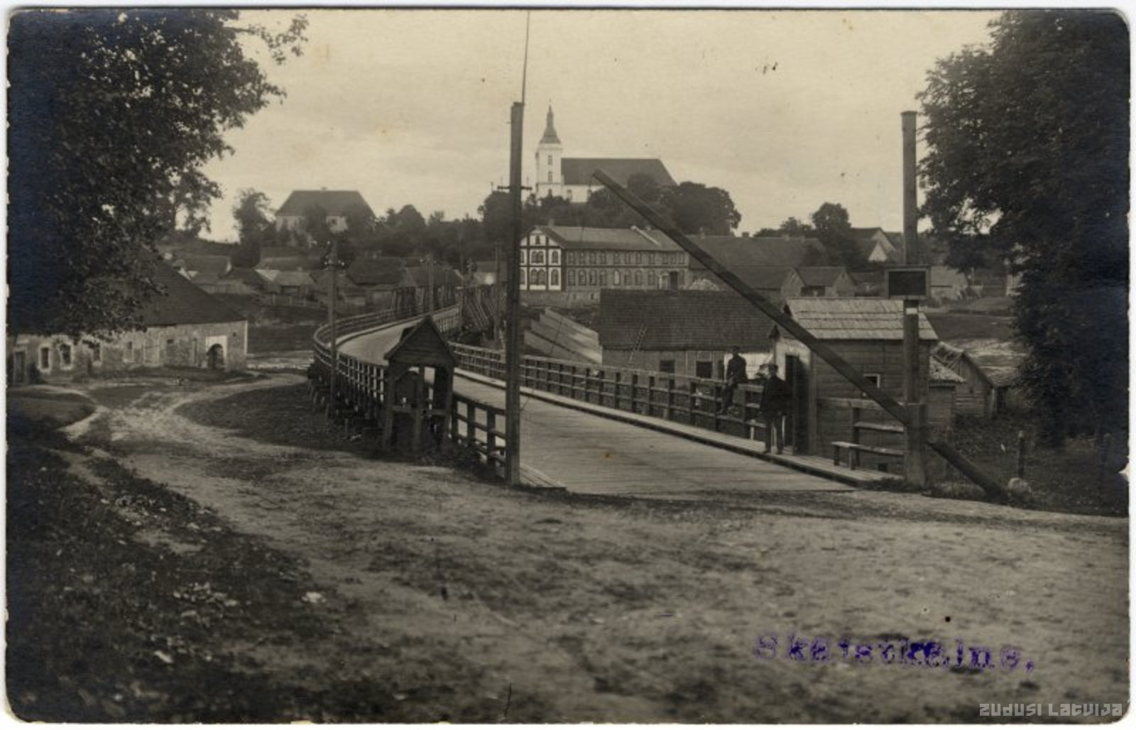 Skats no Lietuvas puses pāri Mēmelei uz Skaistkalni, priekšplānā Lietuvas robežpunkts; redz arī tiltu pār Mēmeli
