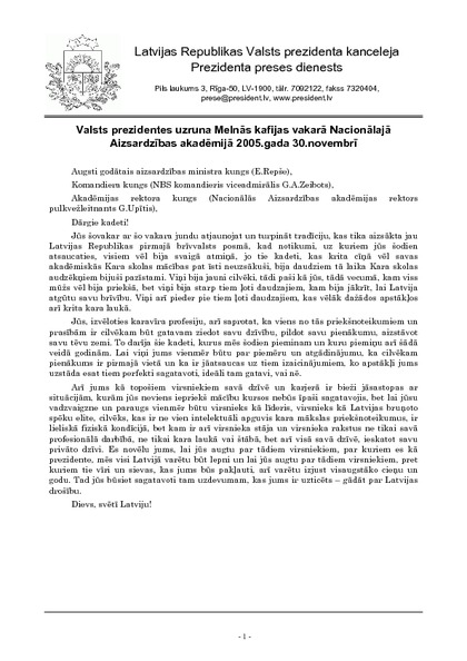 Valsts prezidentes uzruna Melnās kafijas vakarā Nacionālajā Aizsardzības akadēmijā 2005.gada 30.novembrī