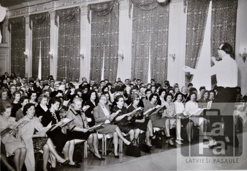Kora mēģinājums 4. latviešu Dziesmu svētkiem Toronto. Mēģinājumu vada diriģents Arvīds Purvs.