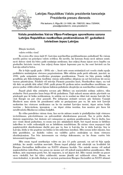 Valsts prezidentes Vairas Vīķes-Freibergas apsveikuma uzruna Latvijas Republikas neatkarības proklamēšanas 87. gadadienā latviešiem ārpus Latvijas