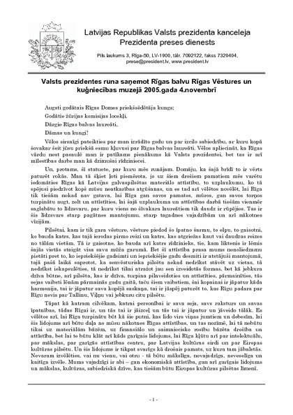 Valsts prezidentes runa saņemot Rīgas balvu Rīgas Vēstures un kuģniecības muzejā 2005.gada 4.novembrī