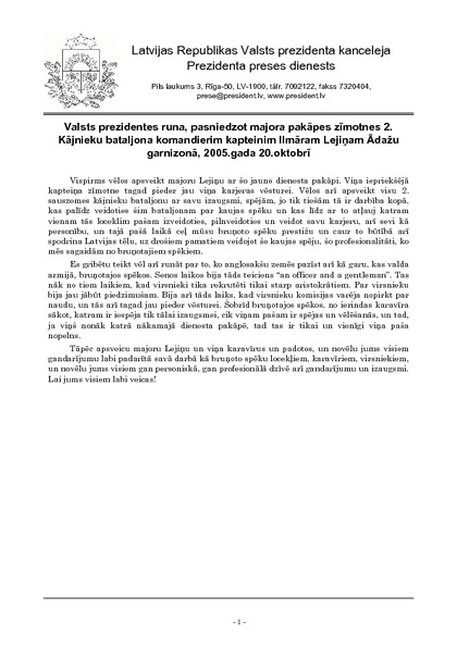 Valsts prezidentes runa, pasniedzot majora pakāpes zīmotnes 2. Kājnieku bataljona komandierim kapteinim Ilmāram Lejiņam Ādažu garnizonā, 2005.gada 20.oktobrī