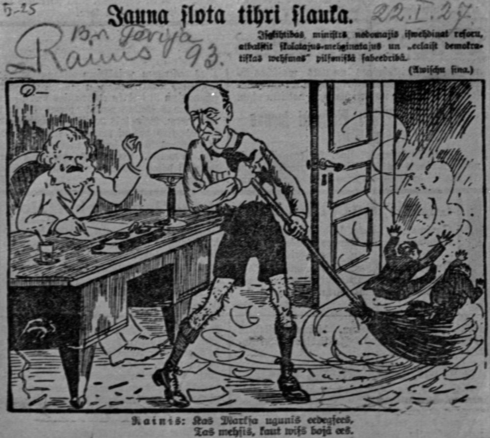 Laikraksta "Brīvā Tēvija" 1927. gada 22. janvāra izdevumā ievietotā karikatūra par Raiņa iecelšanu Latvijas izglītības ministra amatā. Karikatūra balstīta uz laikrakstu ziņojumiem, ka jaunais izglītības ministrs nodomājis "izvēdināt" resoru, atbalstīt skolotājus eksperimentētājus un ieviest demokrātiskas vēsmas sabiedrībā. Fotokopija.