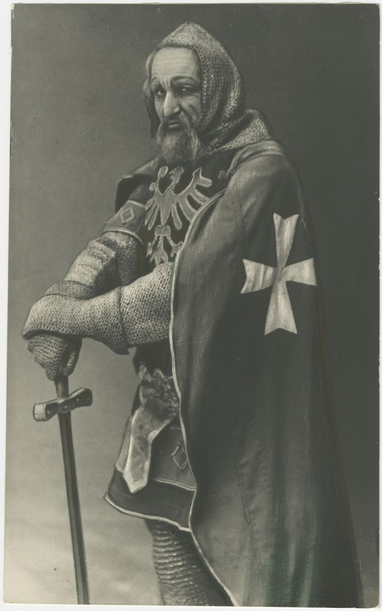 Aktieris Aleksis Mierlauks Berneka lomā Raiņa traģēdijas "Indulis un Ārija" pirmiestudējumā Jaunajā Rīgas teātrī. Režisors Alfrēds Amtmanis-Briedītis, scenogrāfs Jānis Kuga.