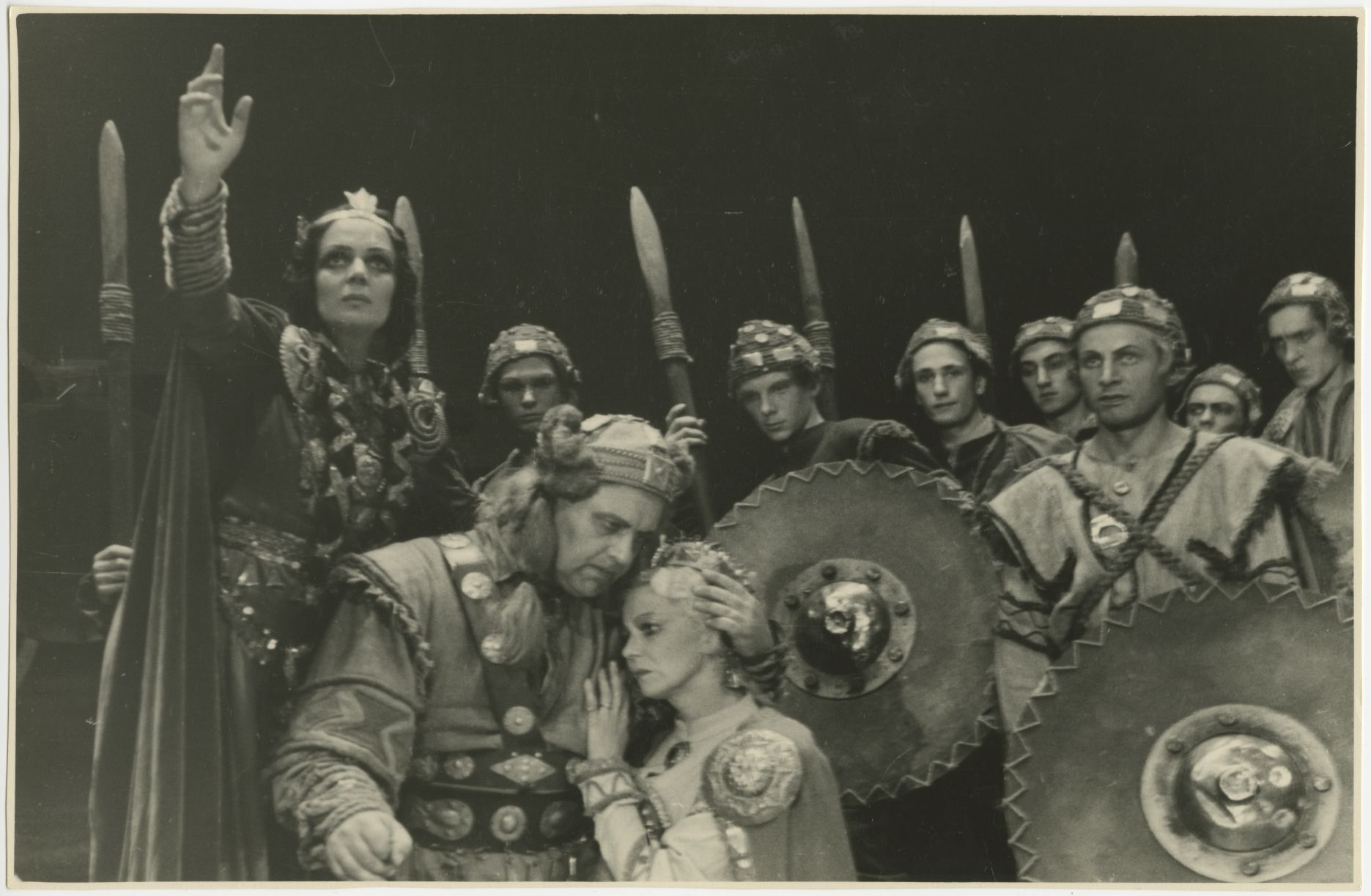 Skats no Raiņa lugas "Uguns un nakts" iestudējuma Latvijas PSR Valsts Dailes teātrī. Aktieris Artūrs Filipsons Lāčplēša lomā, aktrise Lilita Bērziņa Spīdolas lomā, aktrise Irma Laiva Laimdotas lomā. Uzveduma inscenētājs Eduards Smiļģis, režisore Felicita Ertnere, scenogrāfs Oto Skulme.