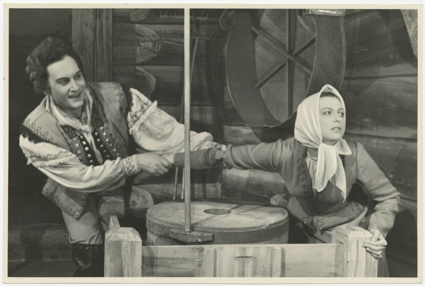 Skats no Raiņa lugas "Pūt, vējiņi!" iestudējuma Latvijas PSR Valsts Dailes teātrī. Aktrise Vija Artmane Baibas lomā, aktieris Žanis Priekulis Ulda lomā. Iestudējuma inscenētājs Eduards Smiļģis, režisore Felicita Ertnere.