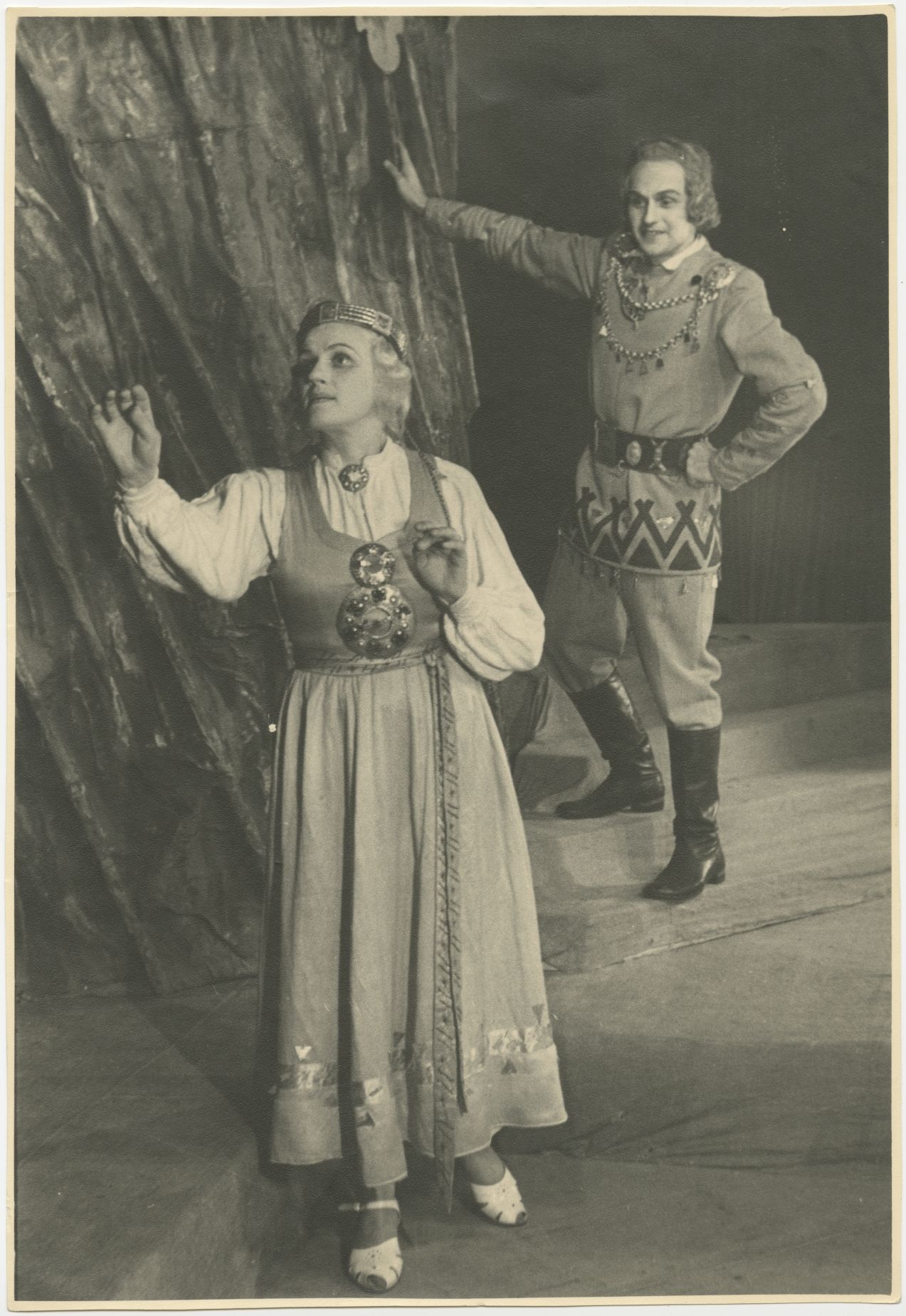 Skats no Raiņa lugas "Krauklītis" iestudējuma Latvijas PSR Valsts jaunatnes teātrī. Aktrise Irma Bune Magones lomā, aktieris Vilis Ķimelis Venta lomā. Izrādes režisors Boriss Praudiņš, scenogrāfs Elerts Treilons.