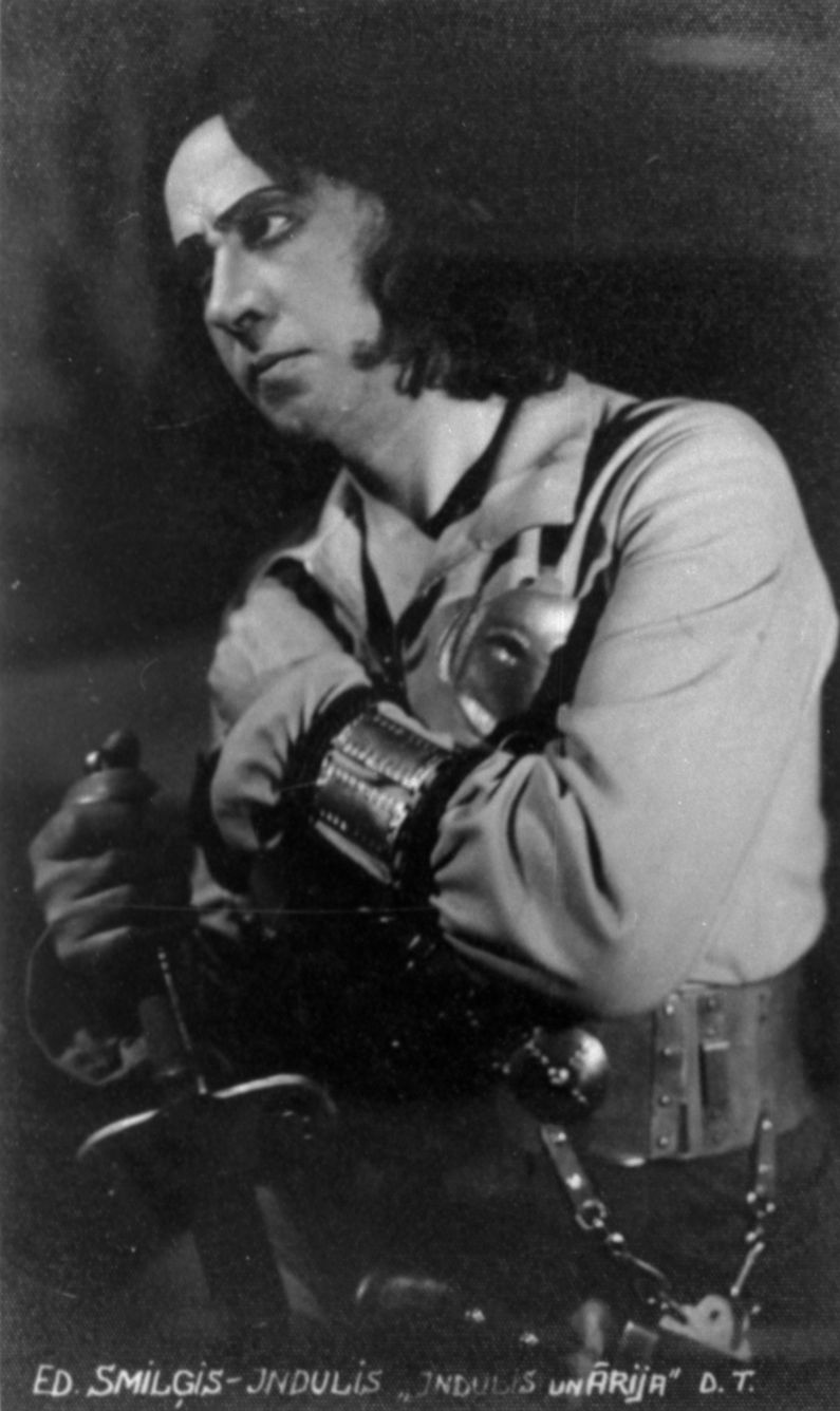 Eduards Smiļģis Induļa lomā Raiņa lugas "Indulis un Ārija" iestudējumā Dailes teātrī. Veltījums teātra 10 gadu jubilejai. Uzveduma inscenētājs Eduards Smiļģis, scenogrāfs Oto Skulme.