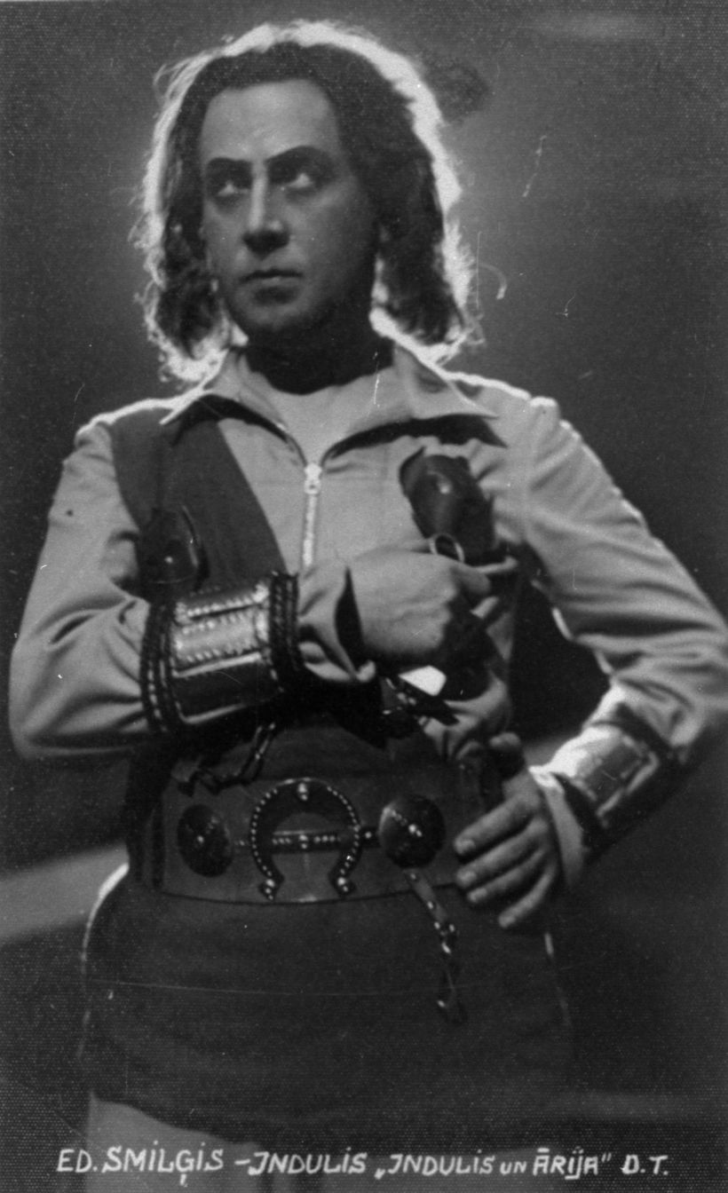 Eduards Smiļģis Induļa lomā Raiņa lugas "Indulis un Ārija" iestudējumā Dailes teātrī. Veltījums teātra 10 gadu jubilejai. Uzveduma inscenētājs Eduards Smiļģis, scenogrāfs Oto Skulme.