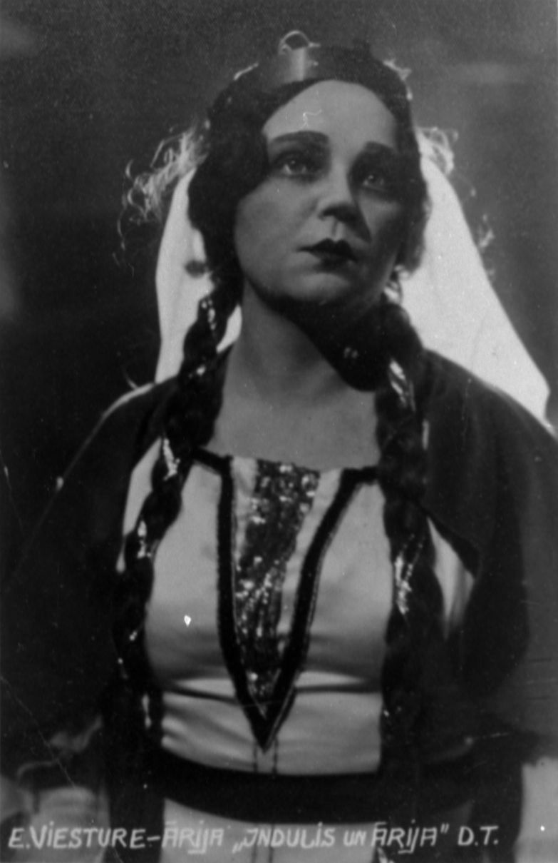 Aktrise Emīlija Viesture Ārijas lomā Raiņa lugas "Indulis un Ārija" iestudējumā Dailes teātrī. Veltījums teātra 10 gadu jubilejai. Uzveduma inscenētājs Eduards Smiļģis, scenogrāfs Oto Skulme.