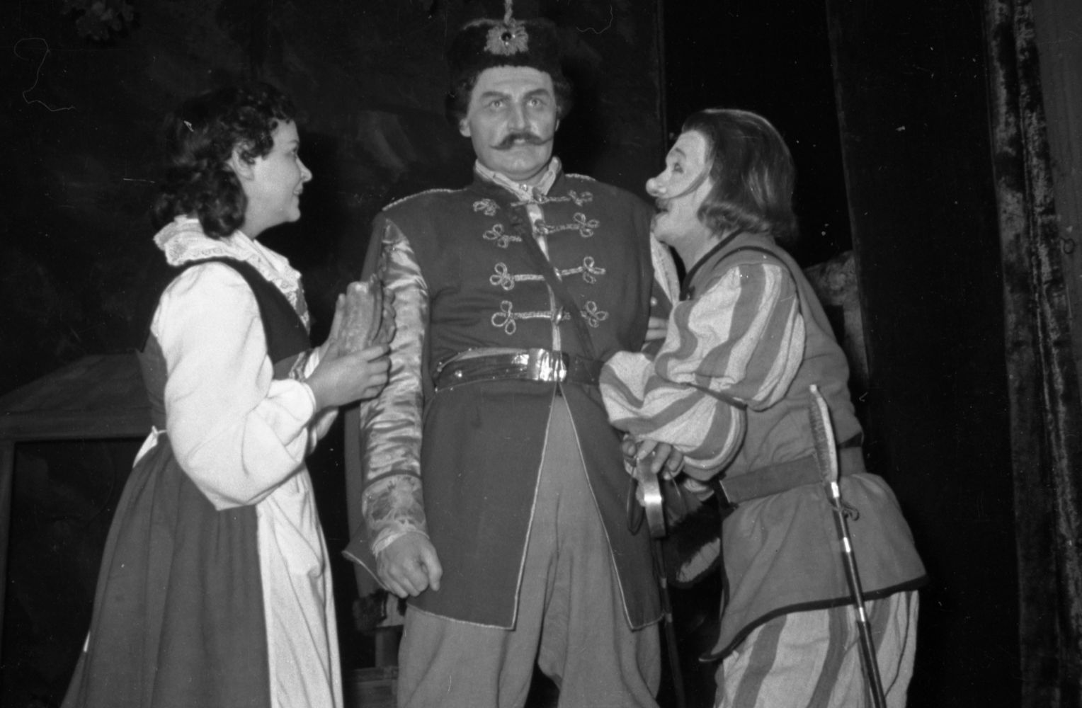Skats no Raiņa lugas "Mīla stiprāka par nāvi" iestudējuma Latvijas PSR Krievu drāmas teātrī (tagad Mihaila Čehova Rīgas Krievu teātris). Lomās (no kreisās): Valentīna Staržinska - Grieta, Broņislavs Dzeruks - Ādams Jakubovskis, Vladimirs Šahovskis - Skudrītis. Režisors Jurijs Jurovskis.