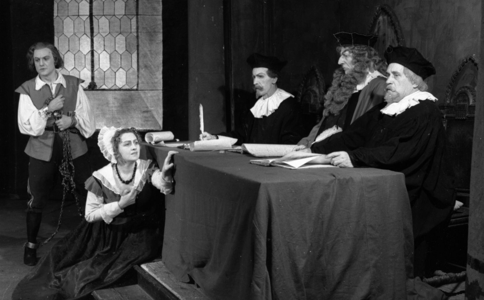 Skats no Raiņa lugas "Mīla stiprāka par nāvi" iestudējuma Latvijas PSR Krievu drāmas teātrī (tagad Mihaila Čehova Rīgas Krievu teātris). Lomās (no kreisās): Nikolajs Krjukovs - Viktors Heils, Jevgeņija Krilova - Frīda, Vladislavs Mihalevičs - Tiesas piesēdētājs, Sergejs Antipovs - Zemes tiesnesis, Nikolajs Urvancovs - Tiesas piesēdētājs. Režisors Jurijs Jurovskis.