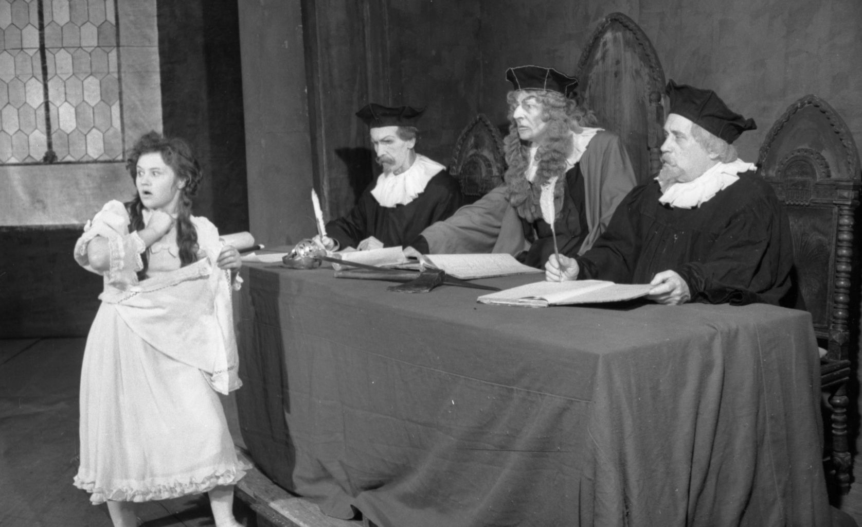 Skats no Raiņa lugas "Mīla stiprāka par nāvi" iestudējuma Latvijas PSR Krievu drāmas teātrī (tagad Mihaila Čehova Rīgas Krievu teātris). Lomās (no kreisās): Ņina Rosihina - Lienīte, Vladislavs Mihalevičs - Tiesas piesēdētājs, Sergejs Antipovs - Zemes tiesnesis, Nikolajs Urvancovs - Tiesas piesēdētājs. Režisors Jurijs Jurovskis.