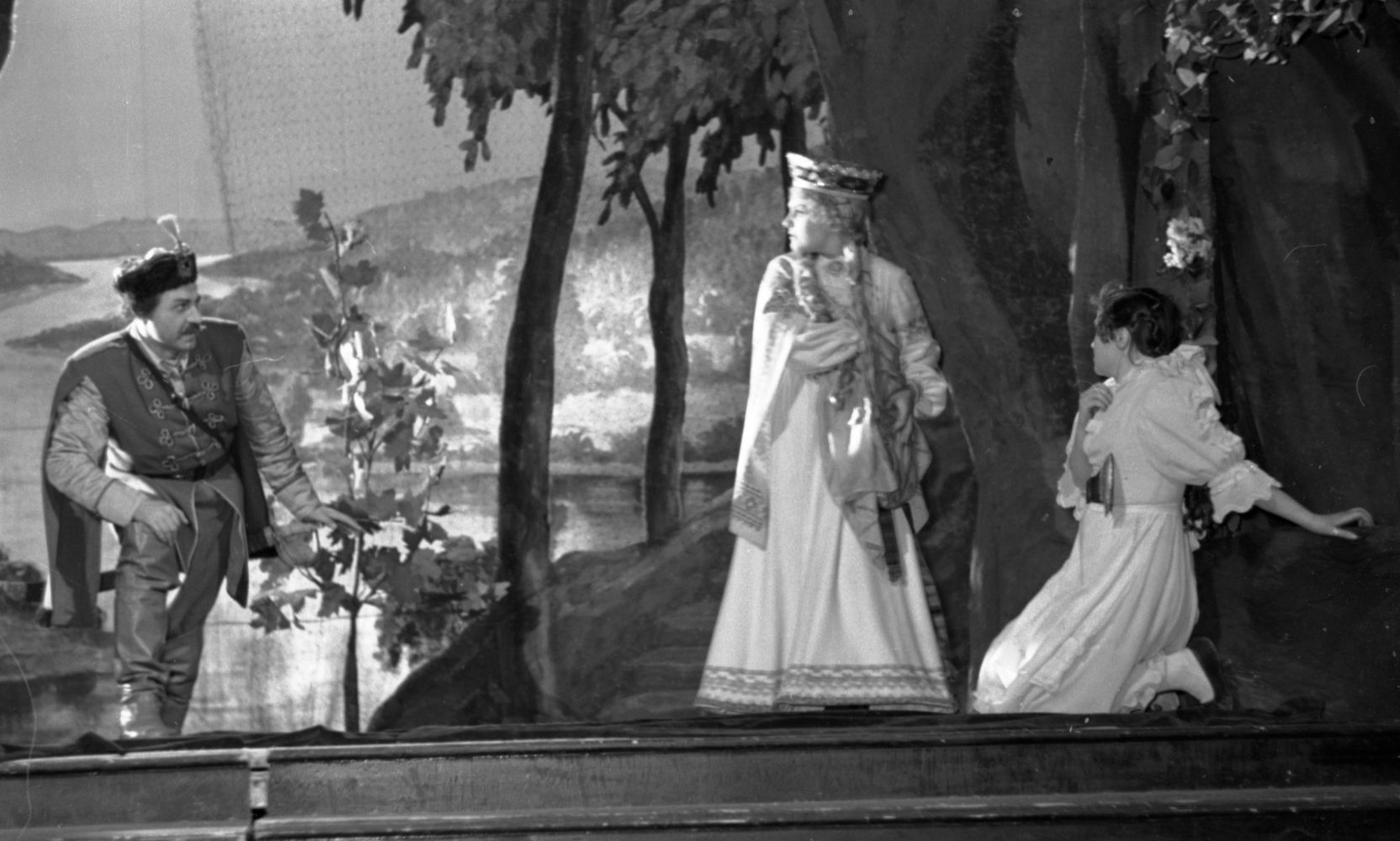 Skats no Raiņa lugas "Mīla stiprāka par nāvi" iestudējuma Latvijas PSR Krievu drāmas teātrī (tagad Mihaila Čehova Rīgas Krievu teātris). Lomās: Alla Isajeva - Maija (centrā), Broņislavs Dzeruks - Ādams Jakubovskis, Ņina Rosihina - Lienīte. Režisors Jurijs Jurovskis.