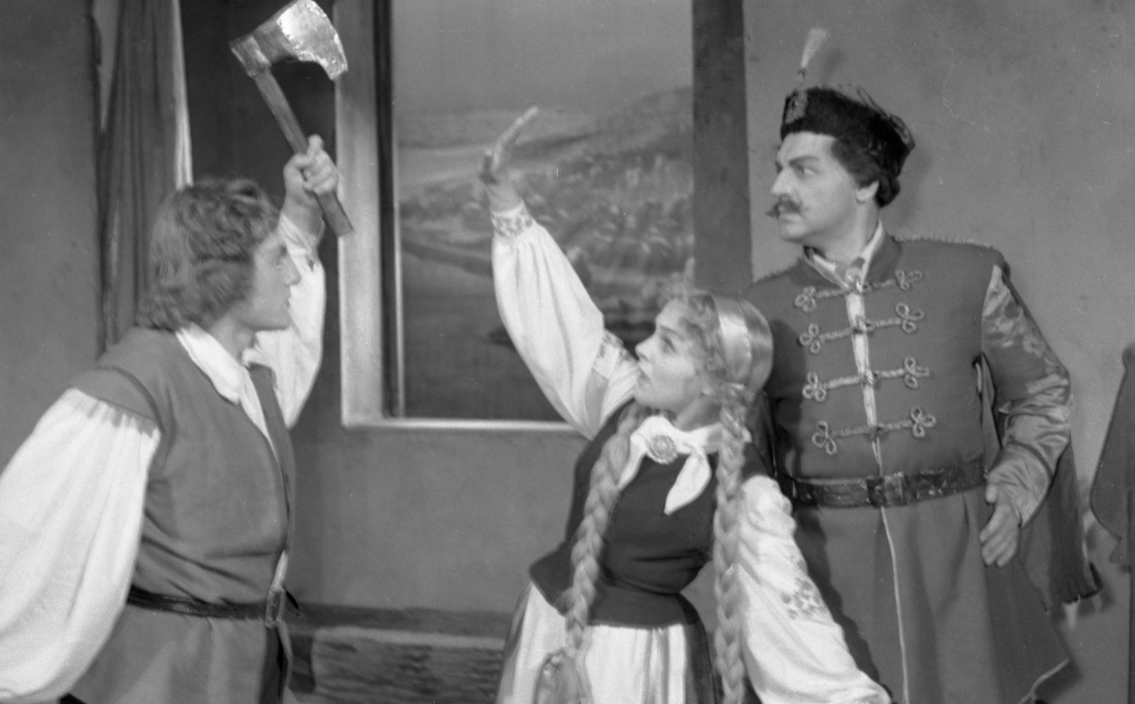 Skats no Raiņa lugas "Mīla stiprāka par nāvi" iestudējuma Latvijas PSR Krievu drāmas teātrī (tagad Mihaila Čehova Rīgas Krievu teātris). Lomās no kreisās): Nikolajs Krjukovs - Viktors Heils, Alla Isajeva - Maija, Broņislavs Dzeruks - Ādams Jakubovskis. Režisors Jurijs Jurovskis.