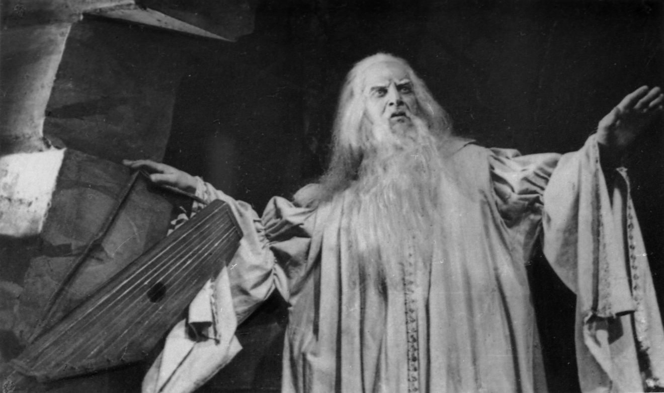 Aktieris Emīls Mačs Laika veča lomā Raiņa lugas "Uguns un nakts" iestudējumā Latvijas PSR Valsts Dailes teātrī. Uzveduma inscenētājs Eduards Smiļģis, režisore Felicita Ertnere, scenogrāfs Oto Skulme.