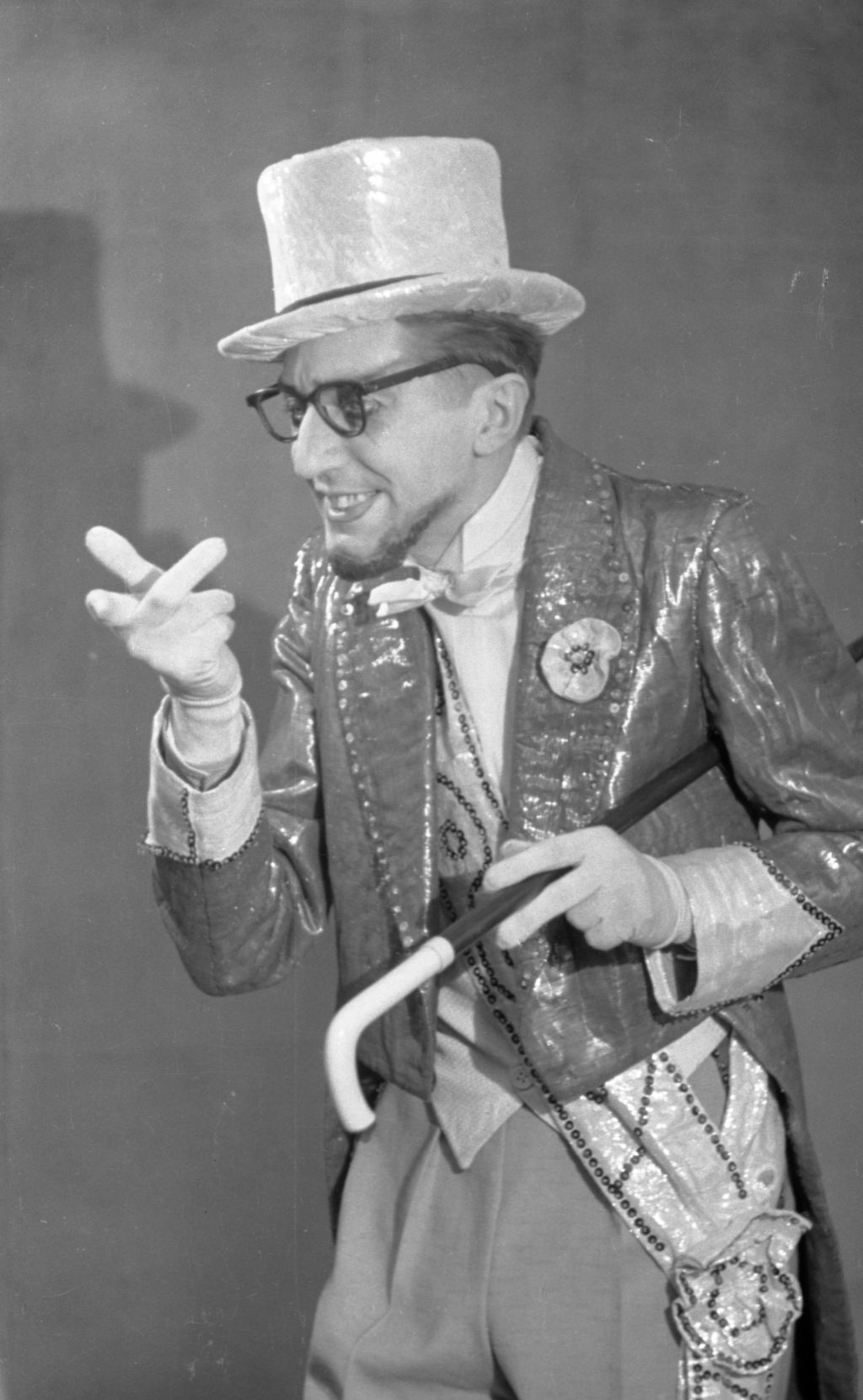 Aktieris Valentīns Skulme Jaunā velna lomā Raiņa lugas "Spēlēju, dancoju" iestudējumā Latvijas PSR Valsts Dailes teātrī. Uzveduma inscenētājs Eduards Smiļģis, režisore Felicita Ertnere, mākslinieks Ģirts Vilks.