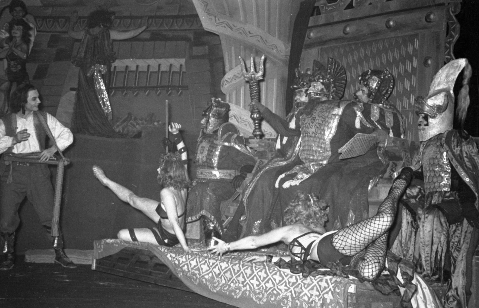 Skats no Raiņa lugas "Spēlēju, dancoju" iestudējuma Latvijas PSR Valsts Dailes teātrī. Lomās: Harijs Liepiņš - Tots, Žanis Priekulis, Osvalds Bērziņš, Juris Strenga - Trejgalvis. Uzveduma inscenētājs Eduards Smiļģis, režisore Felicita Ertnere, mākslinieks Ģirts Vilks.