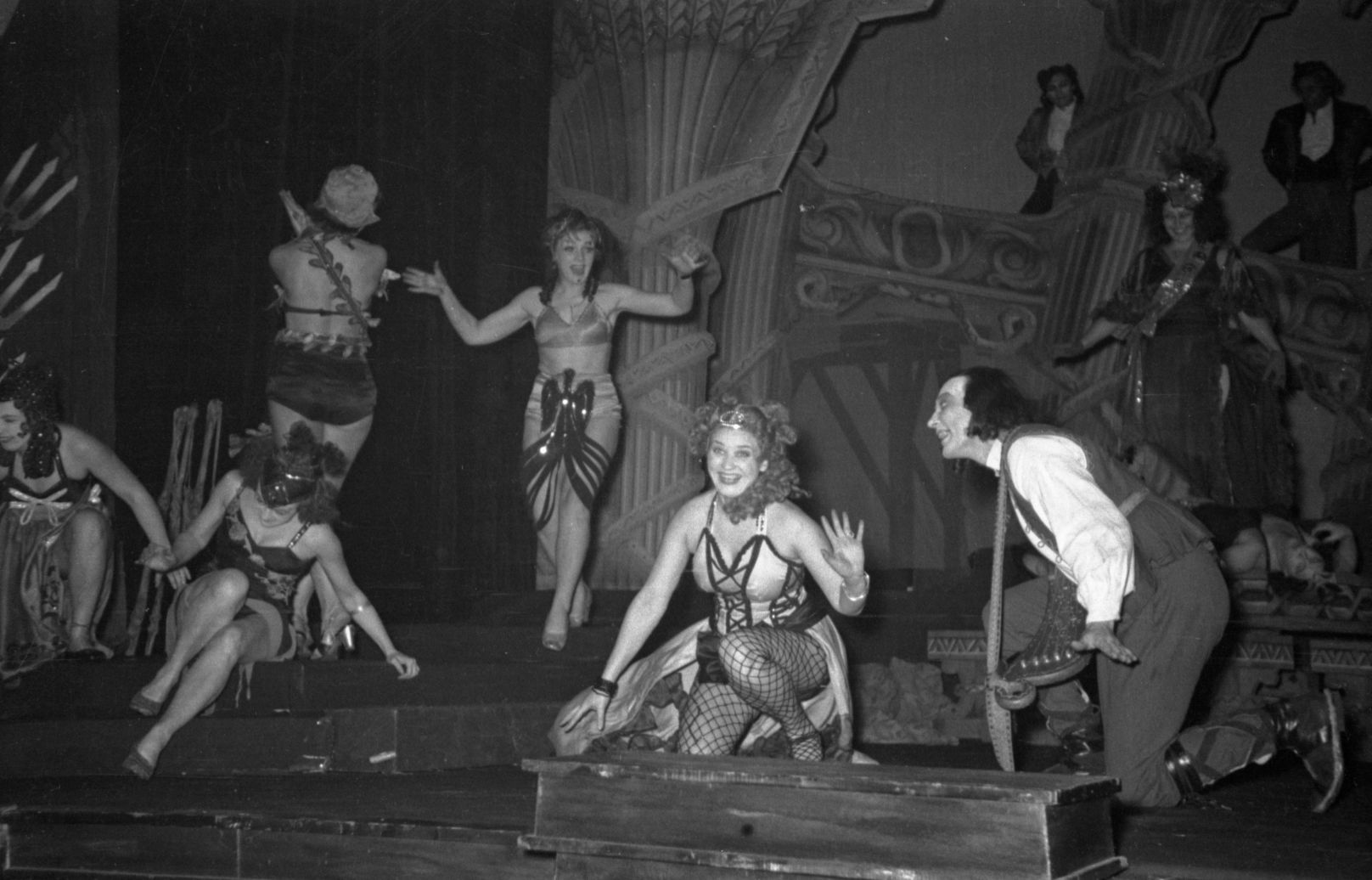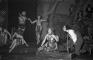 Skats no Raiņa lugas "Spēlēju, dancoju" iestudējuma Latvijas PSR Valsts Dailes teātrī. Velnu rijas ainas skats, Tota lomā Harijs Liepiņš. Uzveduma inscenētājs Eduards Smiļģis, režisore Felicita Ertnere, mākslinieks Ģirts Vilks.