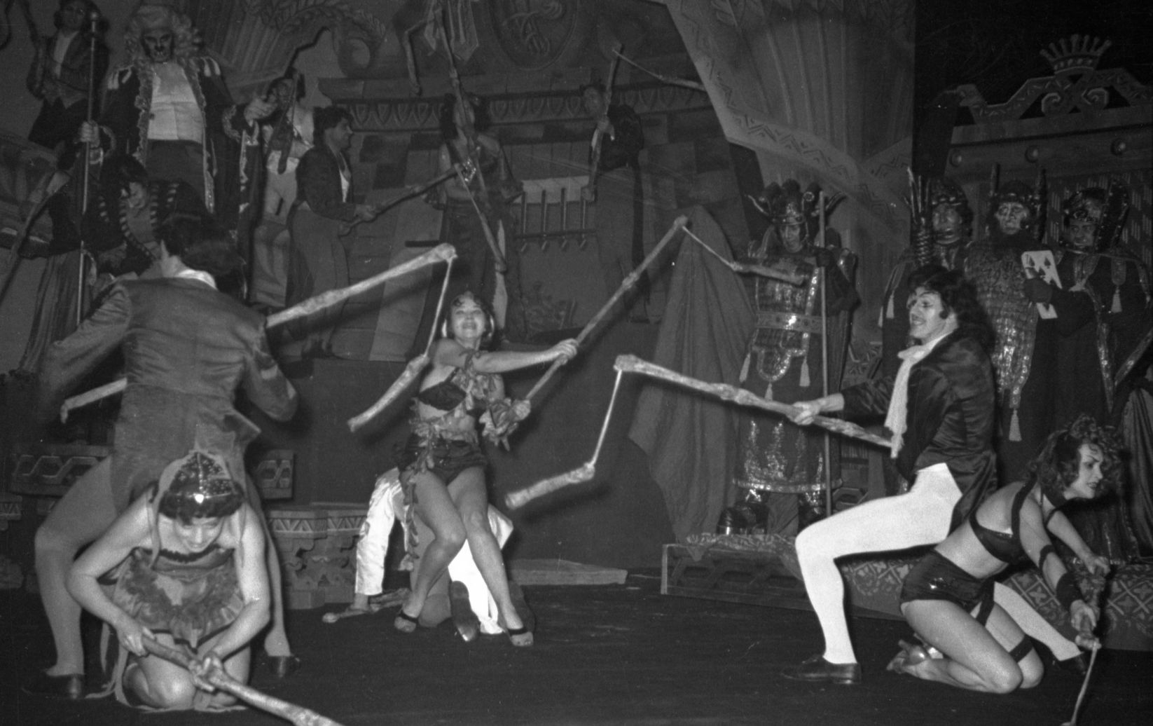 Skats no Raiņa lugas "Spēlēju, dancoju" iestudējuma Latvijas PSR Valsts Dailes teātrī. Velna rijas aina. Uzveduma inscenētājs Eduards Smiļģis, režisore Felicita Ertnere, mākslinieks Ģirts Vilks.