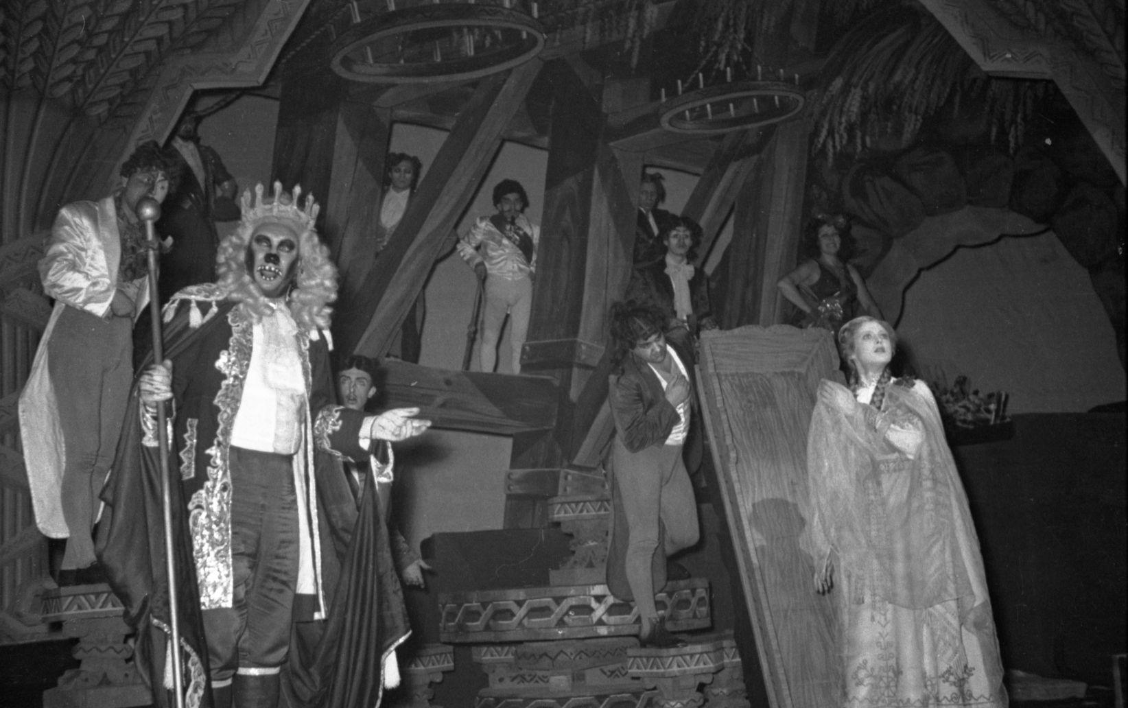 Skats no Raiņa lugas "Spēlēju, dancoju" iestudējuma Latvijas PSR Valsts Dailes teātrī. Kunga lomā Artūrs Dimiters, Leldes lomā Vija Artmane. Uzveduma inscenētājs Eduards Smiļģis, režisore Felicita Ertnere, mākslinieks Ģirts Vilks.