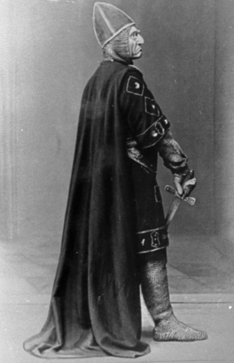 Aktieris Gustavs Žibalts Melnā bruņinieka lomā Raiņa lugas pirmiestudējumā Jaunajā Rīgas teātrī. Uzveduma inscenētājs Aleksis Mierlauks, scenogrāfs Jānis Kuga. Iestudējums iekļauts Latvijas Kultūras kanonā.